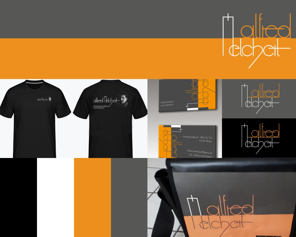 Referenzen: Alfred Melchert (Künstler) < zurück Design:Logo, Geschäftspapiere, Tasche aus LKW-Plane, Banner, T-Shirts